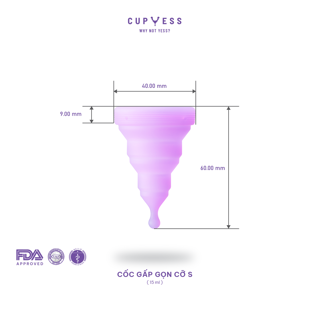 Cỡ S (15ml) thích hợp với nàng dùng cốc nguyệt san lần đầu; chưa sinh nở hoặc sinh mổ; ngày đầu & ngày cuối chu kì hoặc lượng chảy ít đến trung bình